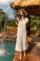 The Soft Sands Jumpsuit with Pockets is a stylish and versatile garment that offers both comfort and chic style. This jumpsuit features button detailing that adds a touch of sophistication to the design. The wide-leg silhouette is on-trend and flattering, providing a flowy and relaxed fit. With pockets for added functionality, this jumpsuit is practical and convenient for carrying small essentials. Perfect for various occasions, from casual outings to dressed-up events, this jumpsuit is a fashionable and effortless choice for a complete and trendy outfit.